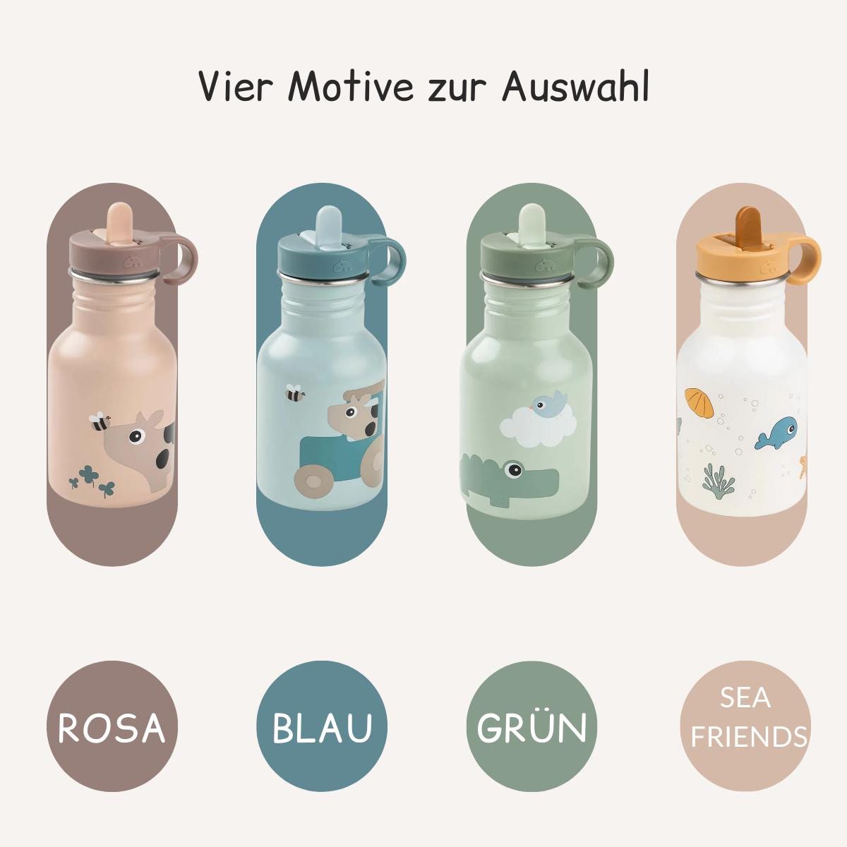 Die Trinkflasche ist in vier modernen Farben erhältlich – Grün, Blau, Rosa und Weiß.